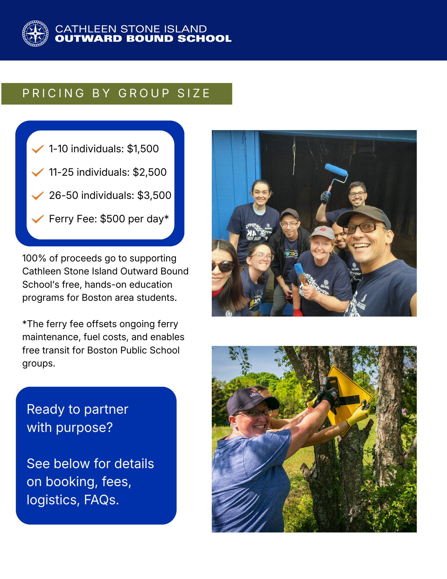 Groups may not reschedule their day or downgrade their group size after they are invoiced. Invoices are issued upon confirmation of the date with company representative. The only exception is in the event of extreme weather, in which CSIOBS will move the day to a reserved rain date in the same month.
